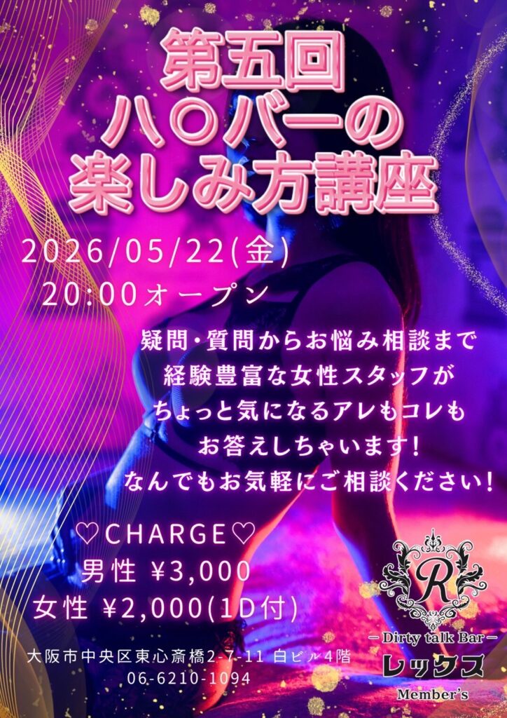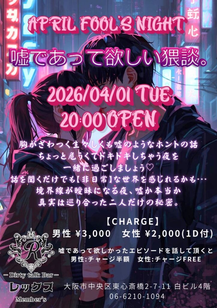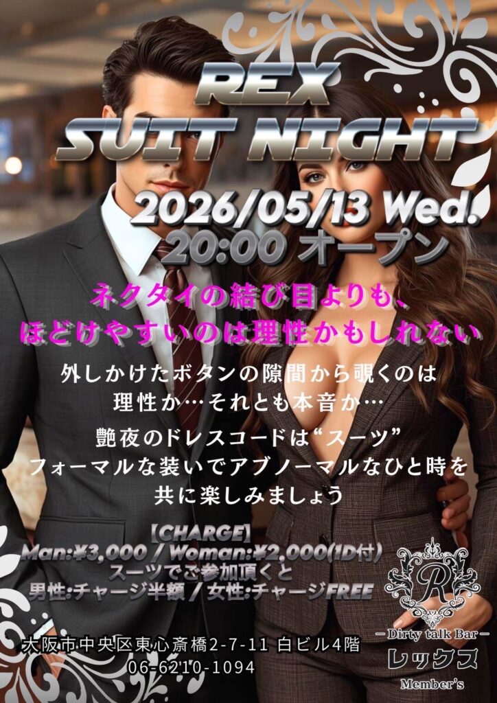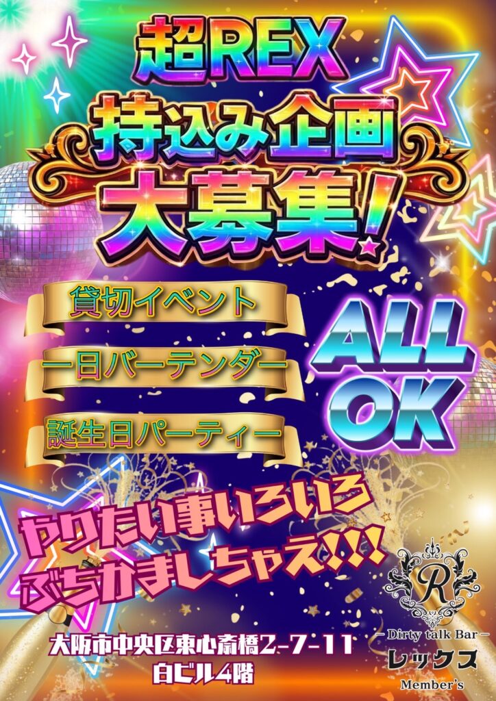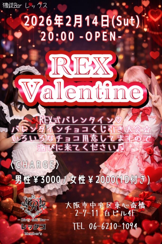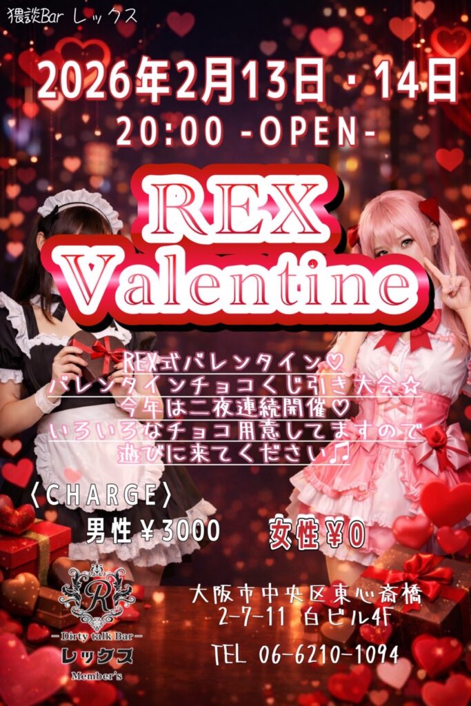 大阪心斎橋の繁華街にひっそりと佇むバー レックス。そこは様々な性癖や悩みを抱えた人々の心の拠り所になる不思議な空間。歓談・猥談を楽しむ大人の社交場です。性別や身分に関係なく、誰もが愉しくオープンになれる魔法のひととき。普段の生活では気軽に話すことが出来ないセンシティブな部分を隠すことなく話せる唯一無二の空間です。あなたも足を踏み入れてみませんか?きっと忘れられない一夜になることをお約束します。